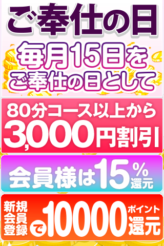 【特典1】 80分コース以上で3000円割引 【特典2】 会員様15%還元! ご新規様には10000ポイントプレゼント!